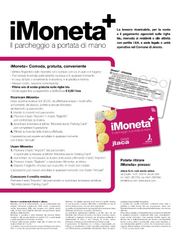 · Elimina l’ingombro delle monetine ed è sempre con voi, in auto o in furgone iMoneta+ viene rilasciata a persona fisica in possesso di patente di guida, residente nel comune di Jesolo o a